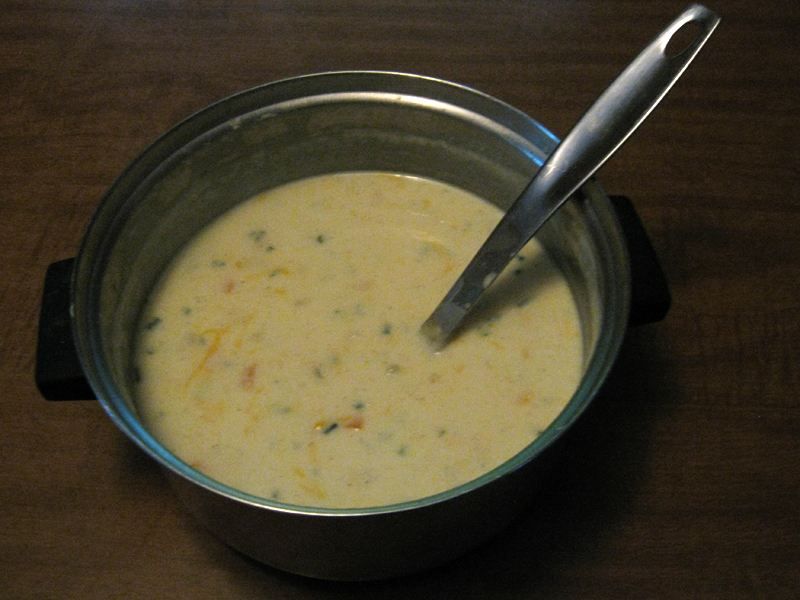 I tried something new for dinner last night. I’d been feeling like potato soup and a nice crusty bread for days, and finally decided to make it. I couldn’t find a potato soup recipe I really liked, so I combined elements from this recipe and this recipe. I must be getting better at doing this, because it was such a hit I’m not going to have to do any more tweaking.