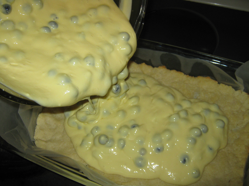 In a large mixing bowl, combine cream cheese and sour cream with an electric mixer. Beat on medium speed until smooth. Add in the sugar and beat on medium-high speed until light and fluffy, about 1-2 minutes. Beat in the eggs one at a time, mixing well after each addition. Blend in vanilla, salt, and lemon juice. Fold in blueberries gently with a spatula until evenly incorporated. Pour mixture over the shortbread crust.