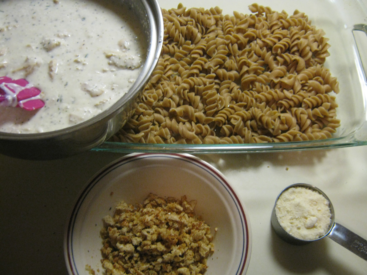While chicken mixture is cooking, crumble the toasted bread into the melted butter, then stir in Italian seasoning. Once chicken mixture is done, pour it over the pasta. Sprinkle with Parmesan cheese and breadcrumbs. Cover the pan with aluminum foil. Bake in at 350°F for 15 minutes. Remove foil. Bake 5 minutes more or until heated through and bubbling.