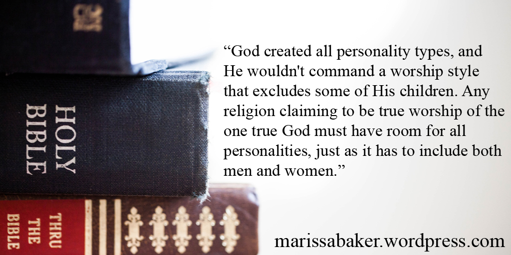 God created all personality types, and He wouldn’t command a worship style that excludes some of His children. Any religion claiming to be true worship of the one true God must have room for all personalities, just as it has to include both men and women. God wouldn’t give people a personality type that isn’t compatible with worshiping Him, so if certain types are driven away because they are not “respected, honored or allowed to” use their gifts, then there must be something wrong with how we humans are constructing our churches.