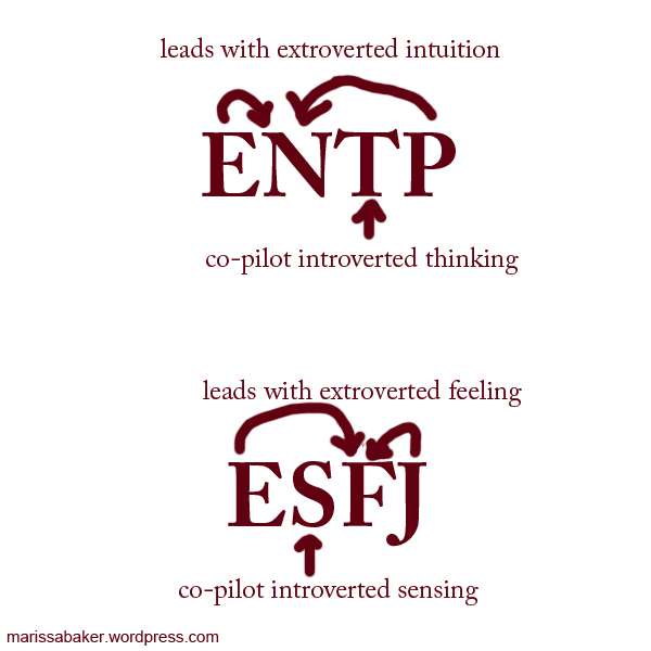 That means that an xSFP type uses Extroverted Sensing and Introverted Feeling as their two “favorite” mental functions. An xNTJ type would use Extroverted Thinking and Introverted Intuition. Now that we’ve found our first two functions, we can start talking about how they stack.