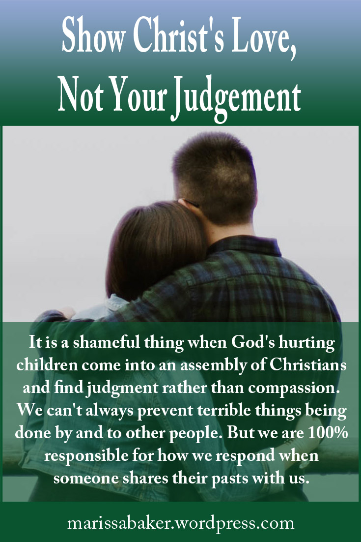 I don’t want to end this post on a depressing note. But it is a shameful thing when hurting people come into an assembly of God’s followers and find judgment rather than compassion. It’s up to us to change that. So make an effort to include the people you don’t like or are inclined to judge (for whatever reason) in church activities and gatherings. Welcome new people into your church. Listen to them with sympathy instead of condemnation. And do the same for people already in your fellowship. Start behaving like Jesus would right now. At the same time, let’s all join in prayer asking Him to transform us on the inside so we’ll truly become as He is.
