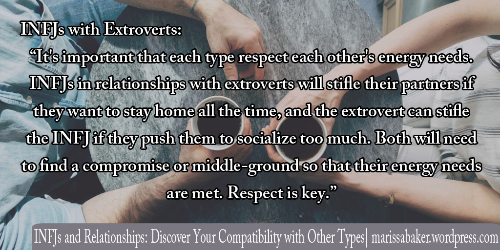 The perks: INFJs enjoy connecting deeply with other people, so an extrovert can introduce them to friends and experiences that allow them to form connections with new and interesting people. The INFJ may occasionally enjoy the excitement of spending time with an extrovert who likes to get out more. The extrovert can enjoy the solace, peace, and comfort of being at home with an INFJ.