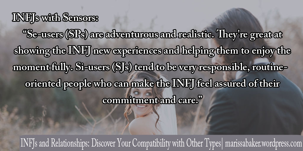 Se-users (SPs) are adventurous and realistic. They’re great at showing the INFJ new experiences and helping them to enjoy the moment fully. Si-users (SJs) tend to be very responsible, routine-oriented people who can make the INFJ feel assured of their commitment and care.