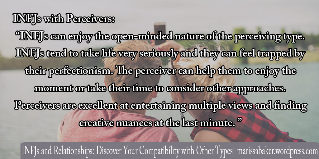 The perks: INFJs can enjoy the open-minded nature of the perceiving type. INFJs tend to take life very seriously and they can feel trapped by their perfectionism. The perceiver can help them to enjoy the moment or take their time to consider other approaches. Perceivers are excellent at entertaining multiple views and finding creative nuances at the last minute. The INFJ, in turn, can help the perceiver to come up with a plan to reach their goals and achieve their dreams before it’s too late.