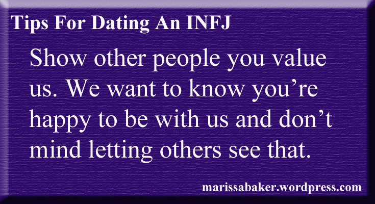 We like to know you’re happy to be with us. Feel free to brag about us to your friends and act like you’re proud to be seen with us. Many INFJs are insecure about their worth and little gestures in this area go a long way toward reassuring us that yes, you really do want to be in a relationship with us. You’ll have to check with the INFJ you’re dating about how much and what type of PDA they’re comfortable with, but in general we like holding hands with you, or having your arm around us, or kisses on the cheek, or when you touch us lightly to let us know you’re there.