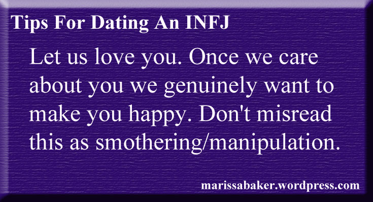 INFJs are sometimes accused of being smothering, intrusive, and manipulative in how they show affection. That is not our intention. Once we’ve decided we care about you then we genuinely want to make you happy and help you in any way we can. So let us shower you with love without worrying if we have some ulterior motive. And if we do seem a little obsessive over you, assume it will pass as we start to feel more secure in the relationship and learn how you prefer for us to to show our love for you.