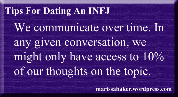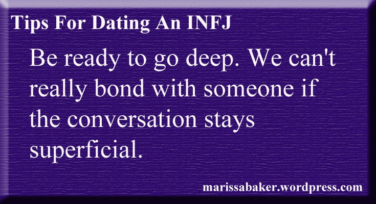 It’s hard for INFJs to open up to people. Most of us have met too many people we don’t feel safe opening up with in the first place. Or we’ve been dismissed too many times by people we thought were safe. So if we start talking with you you need to listen. Don’t minimize our fears, worries, and concerns or make a habit of interrupting us. If we don’t feel heard then we’ll stop trying to let you in and that’s the beginning of the end for this relationship. Also, we will be saying things non-verbally as well. Just because we’re not talking doesn’t mean we’re not telling you something. Feel free to ask questions if you don’t understand something (or to check that you do understand), but don’t just assume that because we aren’t talking nothing’s going on in our heads.