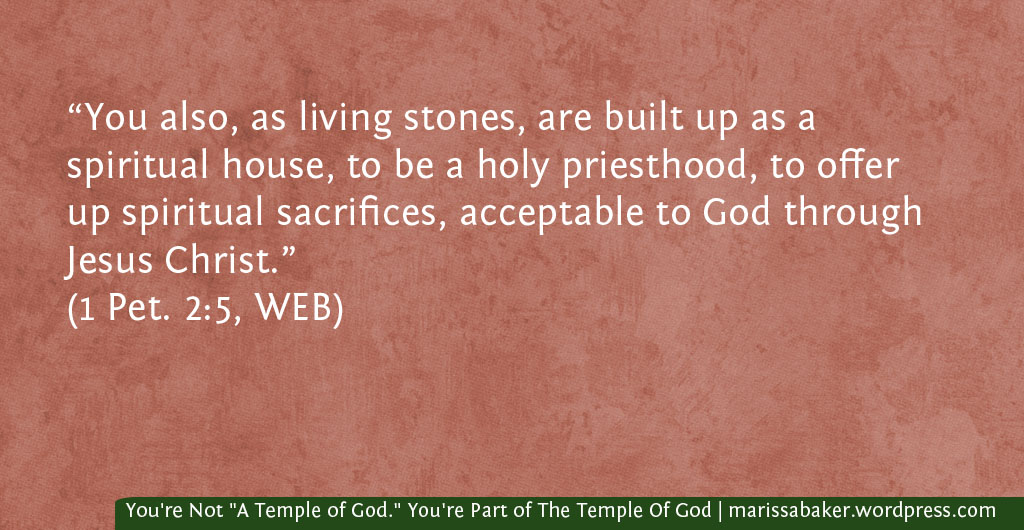 I’ve written about this topic before in a 3-post series on Haggai, but at the time I didn’t understand about the “you” being plural and “temple” singular. So I switch back and forth in those posts between talking about us as individual temples and us as part of a larger temple of God, but you still might find them interesting. Here are the links: