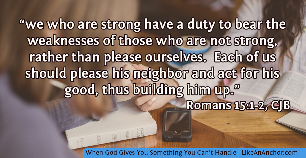 God will let you face situations that you can’t handle alone. But He won’t leave you alone to face them and He never sets you up to fail. We might not always understand why God lets some people go through such overwhelming trials. However, He will be there with you, guiding you through and working things out for good in the end. And He can put people in your life to help as well, but that means His people have to be ready and willing to help each other. We have to pay attention to our brethren and maintain relationships so we know how to be there for them.
