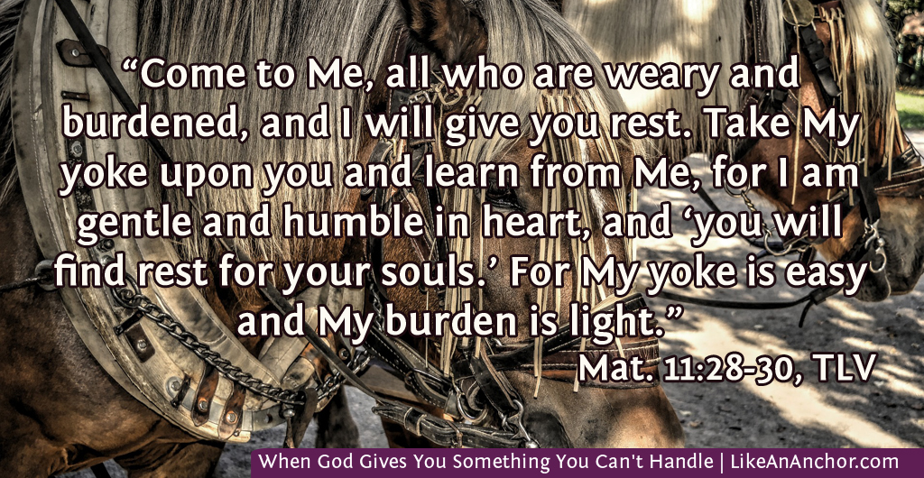 Come to me, all you who labor and are heavily burdened, and I will give you rest. Take my yoke upon you, and learn from me, for I am gentle and humble in heart; and you will find rest for your souls. For my yoke is easy, and my burden is light. (Matt. 11:28-30, WEB)