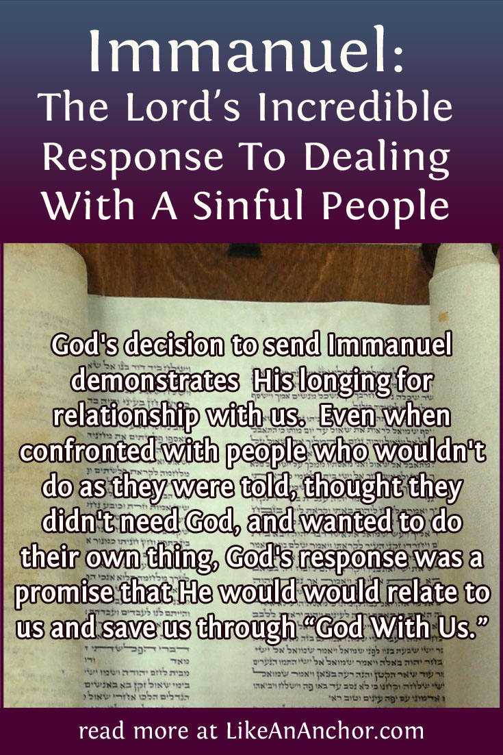 The name Immanuel means “God with us.” It’s part of a beautiful Messianic prophesy that God delivered to a sinful king. When confronted by people who wouldn’t do as they were told, who thought they didn’t need God, and wanted to do their own thing, God’s response was to promise He would come and visit them. He followed through on that promise by coming to live on our plane of existence, getting as close to us as He could so He could relate to us and save us in a uniquely vulnerable way.