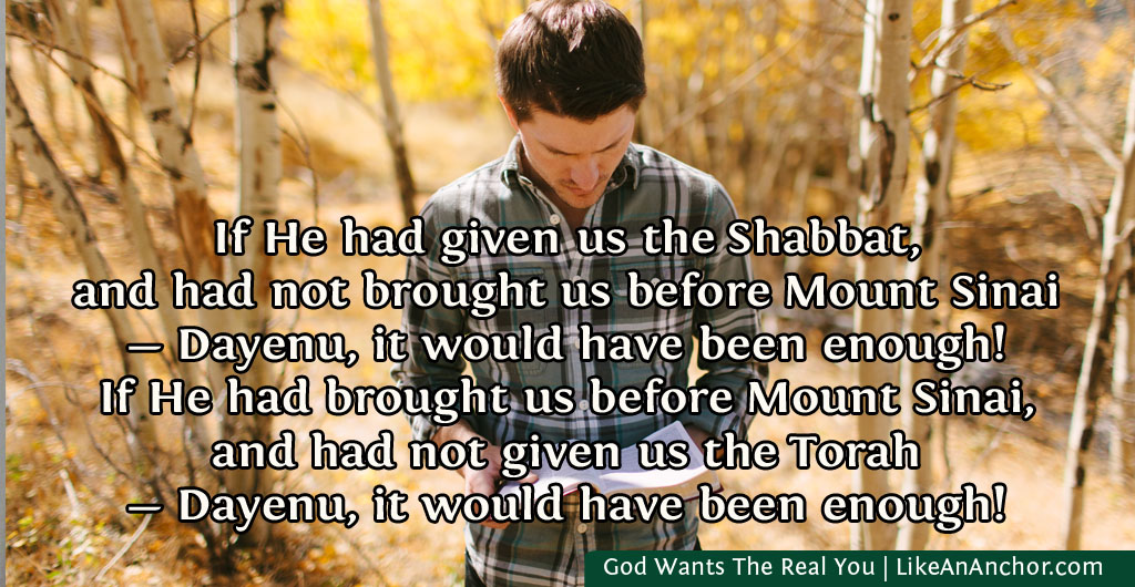 There’s a song called “Dayenu” that’s been part of Jewish Passover celebrations for over a thousand years. That’s not the season we’re in now (we’re in between Yom Teruah and Yom Kippur at the moment), but the song has been on my mind anyway. The title means “it would have been enough” or “it would have sufficed.”
