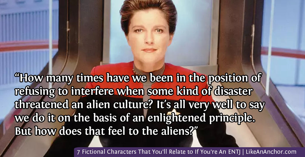 ENTJs often have strong leadership skills, and mature versions of this type can learn to utilize their Thinking strengths alongside the flexibility and empathy needed to work with people in a way that earns their trust and respect. One way that ENTJs can do this is by growing their co-pilot Introverted Intuition and using it to see things from various perspectives rather than adopting a hard-line stance on every issue. One example from Picard is found in the quote I’m featuring for his character. He believes very strongly in morality and justice, but he does not condone blind application of those laws. He has a more nuanced perspective, which I think many NTJ types can relate to.