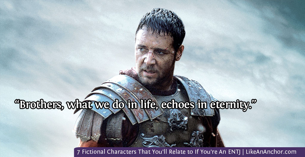 Maximus from Gladiator is the character Susan Storm choose for ENTJ in her article “The Greatest Movie Heroes of Every Myers-Briggs® Personality Type.” In her words, Maximus “captures the strong leadership skills and intense foresight of the ENTJ personality type. He is quick and strategic in his decision-making abilities and can quickly take command of others for the better good. He doesn’t waste time and he’s extremely focused on achieving his goals, for himself and others.”