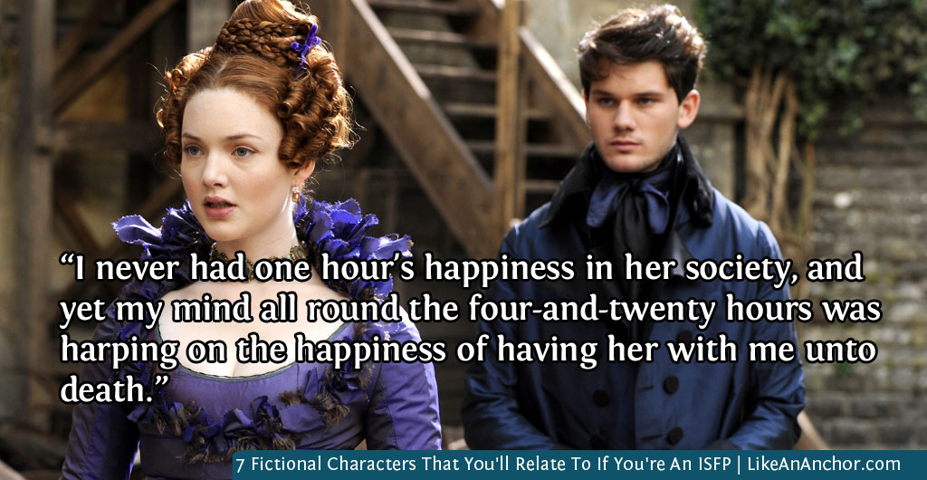 Pip from Charles Dickens’ Great Expectations is one fictional character that demonstrates how an ISFP’s perspective can become skewed when they put too much faith in their tertiary Introverted Intuition. Like many young ISFPs, he’s a gentle and quiet child who feels things incredibly deeply. And he holds on to his passions and convictions, including his love for Estella, with a tenacity that can look crazy to outside observers. Once an FP’s convictions become deeply rooted it is very difficult to shake them, especially if (for ISFPs) they’re also tied-in with the idealism that can come from their less-reliable Intuitive side.