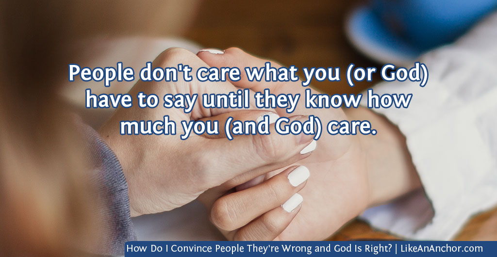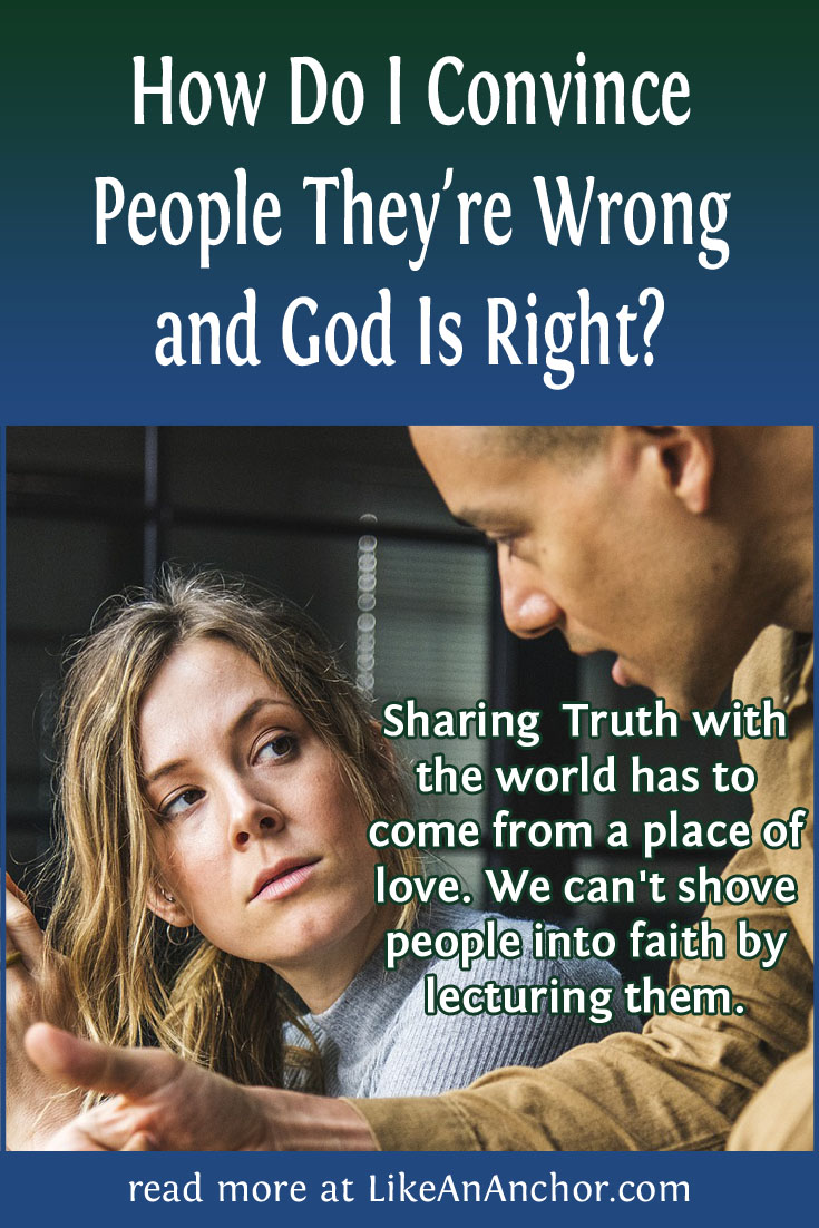 So how do we convince people they’re wrong and God is right? By not making that our goal. We won’t shove people into the kingdom of God with logical arguments or by insisting they’ve got everything wrong. But we can point them toward a relationship with the One who can get them into His kingdom, and we do that by showing His love in all that we are, say, and do. God’s love is transformational inside us and if we share that love with others, it can transform them as well.