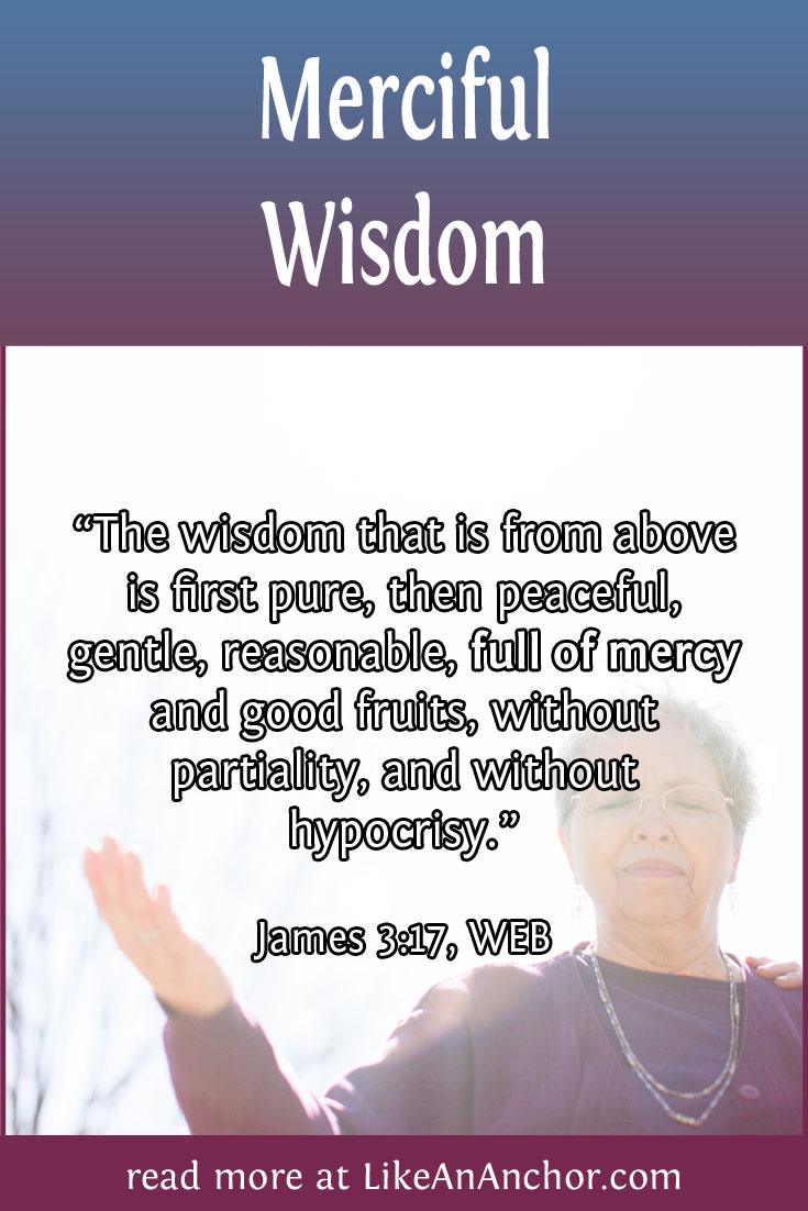 In his epistle, James describes “the wisdom that is from above” as “first pure, then peaceful, gentle, reasonable, full of mercy and good fruits, without partiality, and without hypocrisy” (James 3:17, WEB). We’ve looked at those first four traits in previous posts, and now we come to study merciful wisdom.