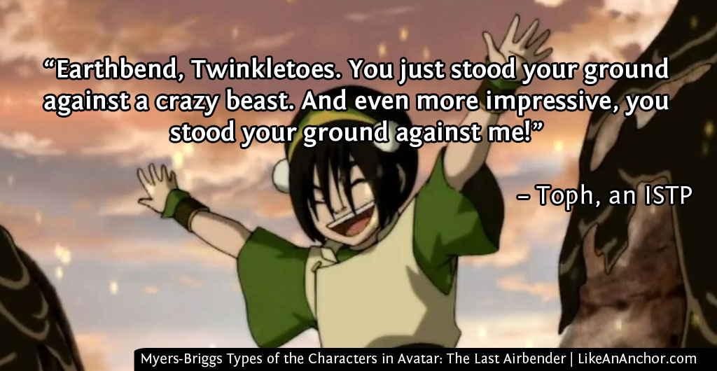 It’s kinda hard to believe Team Avatar survived the whole first season without Toph. She’s the greatest earth bender in the world and makes sure no one forgets it. I type her as an ISTP not simply because they make the best action heroes, but also because she fits the type so well.