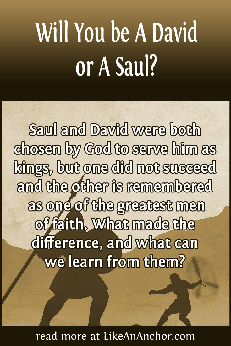 The people decided they didn’t want God ruling over them directly, so God honored their request and picked a man to lead them. The first man God picked for this task was Saul. His rule didn’t last, though, and he was replaced by David. Anyone familiar with scripture knows about King David; he was the man after God’s own heart who is the most prominent human ancestor of the Messiah, Jesus. But what about Saul? Was he just a stepping stone to David; a disposable king? Or did he get the same opportunity as David and responded differently?