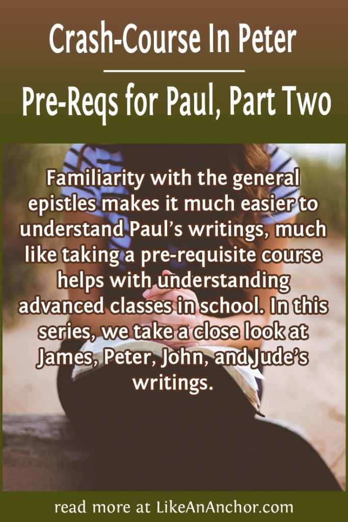 Last week, we started a study on the general epistles by taking a close look at James. As I mentioned in that post, there’s evidence that when the books of the New Testament were first put together the order put James, Peter, John, and Jude’s letters between Acts and Romans (click here to learn more). This meant that if you read straight-through the New Testament, you’d read the general (also called “catholic”) epistles before getting to Paul’s letters. That reading order makes sense, since the letters that James, Peter, John, and Jude write are phrased in simpler language than Paul’s writings. The general epistles also provide a foundation for understanding the connections between Jesus’s teachings, the Old Testament, and our lives as New Covenant believers. You can think of the general epistles as a kind of pre-requisite course to help us with understanding Paul, similar to how you’d need to take general psychology courses before specializing in adolescent psychology or organizational psychology.