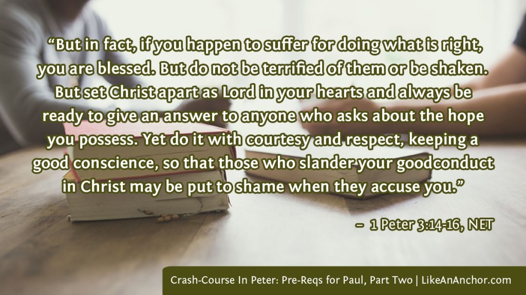 In today’s post, we’re going to focus on Peter’s two epistles. While some scholars question whether these two epistles were written by the same person because of the change in style and tone, I see no reason to doubt the author’s self-identification as Peter (1 Pet. 1:1; 2 Pet. 1:1). The change in writing can easily be explained by the epistles being written at different times and with slightly different focuses. Peter’s letters differ from James’s in having an even broader audience–while James wrote to “the twelve tribes dispersed abroad” (James 1:1), Peter wrote to all those “temporarily residing abroad .. who are chosen by God” (1 Pet. 1:1-2, all quotes from NET translation ). Though the Greek word diaspora is typically used of “Jews not living in Palestine” (NET footnote), the context of the epistle hints that Peter is using the term more generally to address all those living in the word as Christians. For the second letter, he simply calls his audience “those who through the righteousness of our God and Savior, Jesus Christ, have been granted a faith just as precious as ours (2 Pet. 1:1). The audience for these three general epistles broadens as we read through them, mirroring the way God opened the way to salvation up for all people and also laying groundwork for Paul’s more in-depth writings on Jews and Gentiles.