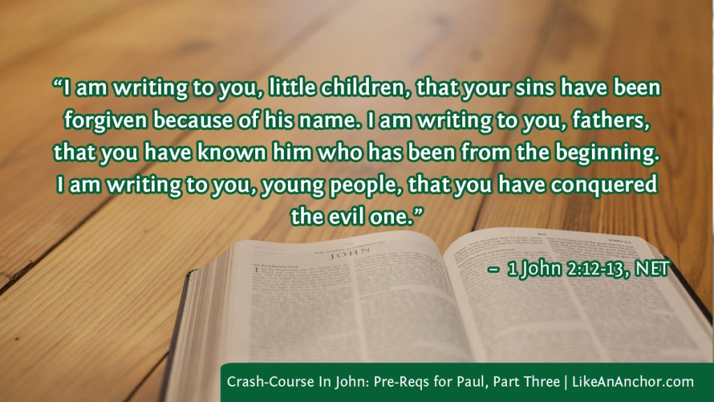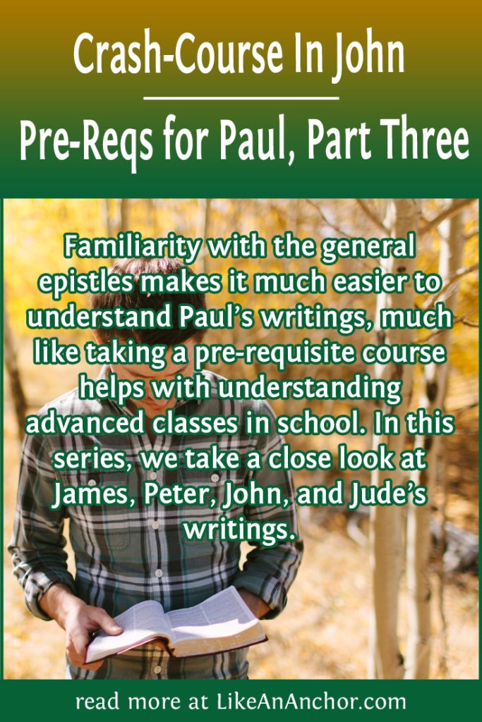 For the last two weeks, we’ve been studying the general epistles. Here are links to the posts on James’s and Peter’s letters. As I mentioned in those posts, there’s evidence that when the books of the New Testament were first put together the order had James, Peter, John, and Jude’s letters between Acts and Romans (click here to learn more). This meant that if you read straight-through the New Testament, you’d read the general (also called “catholic”) epistles before getting to Paul’s letters. That reading order makes sense, since the letters that James, Peter, John, and Jude write are phrased in simpler language than Paul’s writings. The general epistles also give us a foundation for understanding the connections between Jesus’s teachings, the Old Testament, and our lives as New Covenant believers. You can think of the general epistles as a kind of pre-requisite course to help us with understanding Paul’s writings, similar to how you’d need to take intro to composition courses before specializing in teaching writing.