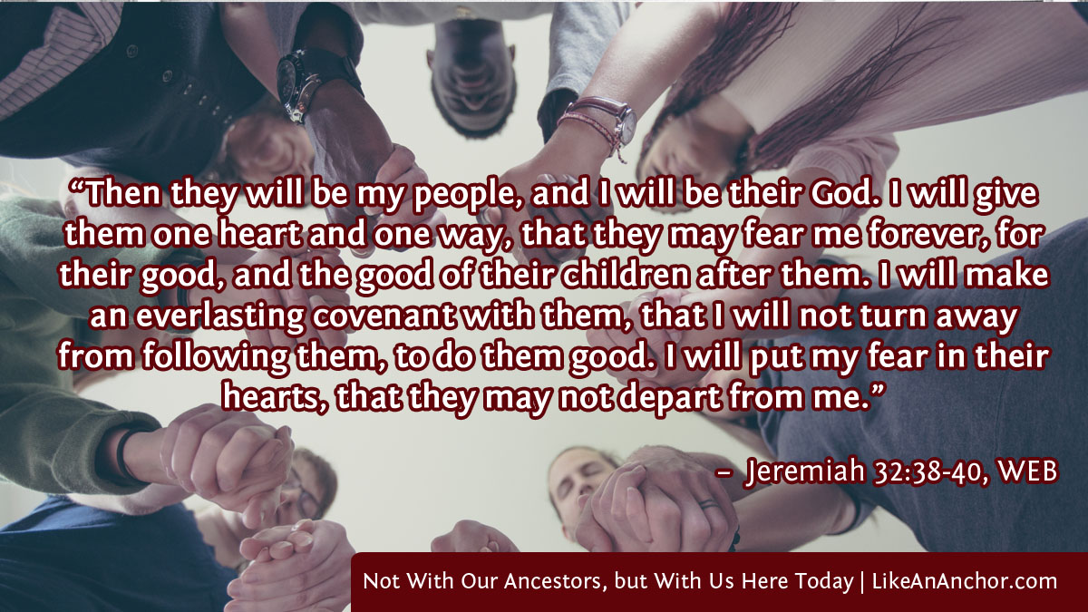 Other than Caleb, Joshua, and Moses there wasn’t any one in the crowd who’d been older than 19 when God made this covenant with His people. Many of his listeners hadn’t even been born yet. It doesn’t matter if they remember it, though. From a spiritual perspective, God cut that covenant with them just as surely as if they’d been in the crowd who said, “We will do all that Yahweh has said, and be obedient” (Ex. 24:7, WEB). Something very similar happens with New Covenant believers as well.