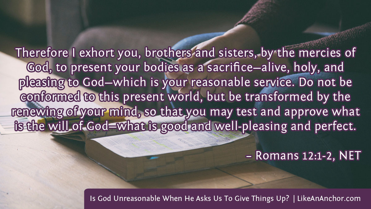 As the sovereign creator, the one who paid a high price to redeem us, and a leader who doesn’t ask of us anything He hasn’t done Himself, it is reasonable for God to have expectations from us. Not only that, but these expectations are good for us. His purpose is to give us eternal life. When God asks us to devote our entire lives to Him, it’s a reasonable request and we can do so willingly when we shift our perspective to reflect the reality of who God is and what He is doing.