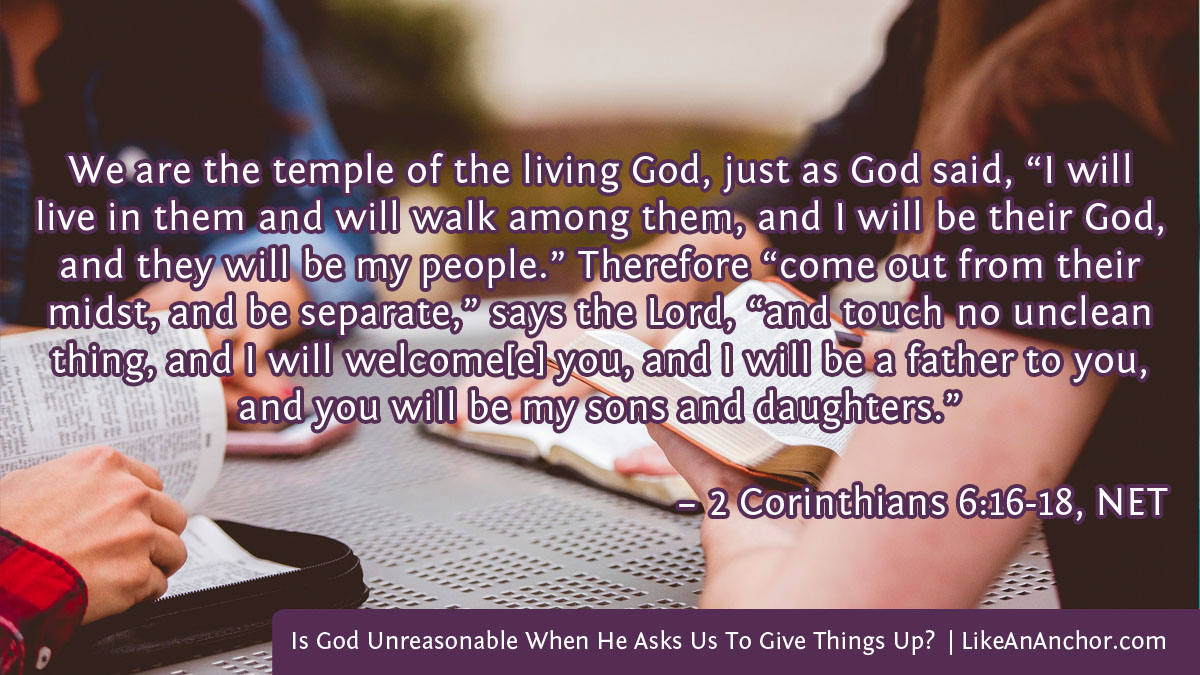 ![Image of four people sitting around a table studying their bibles overlaid with text from 2 Cor. 6:16-18, NET version: "We are the temple of the living God, just as God said, “I will live in them and will walk among them, and I will be their God, and they will be my people.” Therefore “come out from their midst, and be separate,” says the Lord, “and touch no unclean thing, and I will welcome[e] you, and I will be a father to you, and you will be my sons and daughters.”](https://likeananchor.com/wp-content/uploads/2025/05/unreasonable-3.jpg?w=1024)