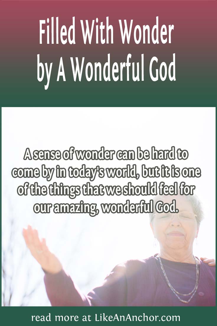 I think it’s easy for us to avoid feeling wonder. We’re busy people living in a busy world, and wonder requires time to rest, to meditate on God’s nature, and to marvel at all He is and does. We also live in a scientific, logical world where we expect things to be explainable by normal means, and wonder involves recognizing there’s something higher, inexplicable, and marvelous than all that. We also tend to be self-focused and self-reliant, and wonder involves looking outside ourselves and standing in awe of the glorious God.