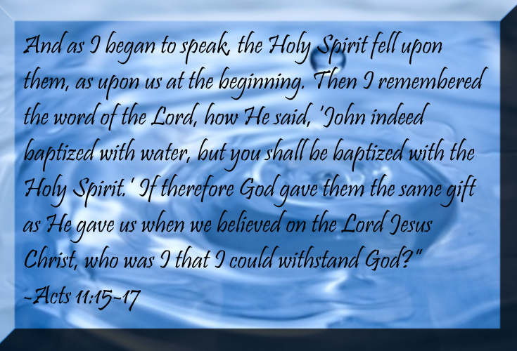 While Peter was still speaking these words, the Holy Spirit fell upon all those who heard the word. And those of the circumcision who believed were astonished, as many as came with Peter, because the gift of the Holy Spirit had been poured out on the Gentiles also. For they heard them speak with tongues and magnify God. Then Peter answered, “Can anyone forbid water, that these should not be baptized who have received the Holy Spirit just as we have?” And he commanded them to be baptized in the name of the Lord. Then they asked him to stay a few days. (Acts 10:44-48)