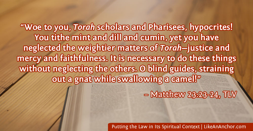 ![Image of a Bible open on a table overlaid with Matt. 23:24, TLV version: “Woe to you, Torah scholars and Pharisees, hypocrites! You tithe[a] mint and dill and cumin, yet you have neglected the weightier matters of Torah—justice and mercy and faithfulness. It is necessary to do these things without neglecting the others. O blind guides, straining out a gnat while swallowing a camel!](https://likeananchor.com/wp-content/uploads/2019/08/law-spirit-3.jpg)