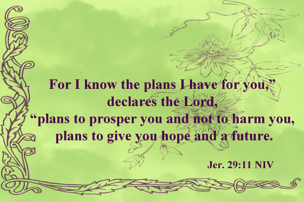 I don’t usually quote the NIV, but I do like the way it phrases verse eleven: “‘For I know the plans I have for you,’ declares the Lord, ‘plans to prosper you and not to harm you, plans to give you hope and a future.'” Even when we’re not sure what our own plans are for the future, we are assured that God has good things in store for us. He wants to see us succeed.