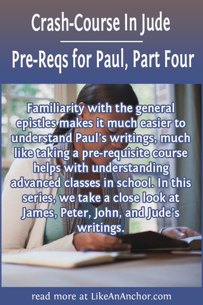 Before we dive into Jude, here are links to the posts on James’s, Peter’s, and John’s letters. As I mentioned in those posts, there’s evidence that when the books of the New Testament were first put together the order had these letters between Acts and Romans (click here to learn more). This meant that if you read straight-through the New Testament, you’d read the general epistles before getting to Paul’s letters. The general epistles give us a foundation for understanding the connections between Jesus’s teachings, the Old Testament, and our lives as New Covenant believers, all of which is essential for properly interpreting Paul’s more complicated teachings. We can think of the general epistles as a kind of pre-requisite course for understanding Paul.