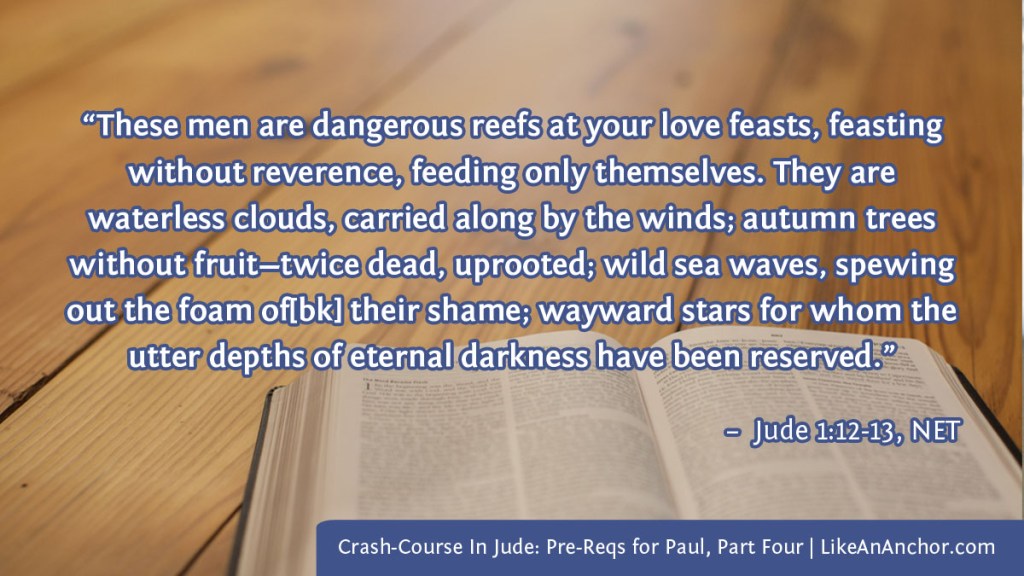 These warnings about those who’ve “secretly slipped in” to the churches are placed alongside reminders from Jude that people who do such wicked things won’t get away with them. He bids his readers remember “that Jesus, having saved the people out of the land of Egypt, later destroyed those who did not believe” and references a couple other Old Testament examples as well (1:5-7). This verse is one of several in the New Testament that explicitly identifies Jesus as the member of the God family who worked directly with Israel. With this short phrase, Jude reminds us that God is the same yesterday, today, and forever and that He still values justice and judgement as well as mercy (Jude 1:14-15).