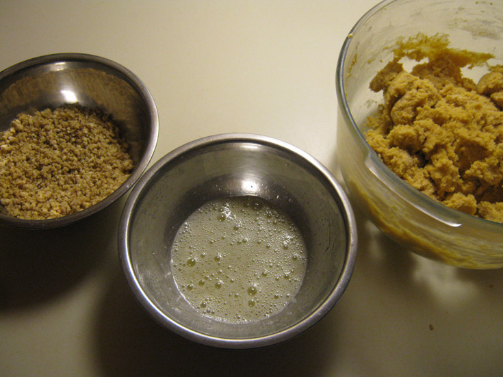 Preheat oven to 325° F. Line a 9-inch spring-form pan with aluminum foil. Using the dough hooks on an electric mixer, cream butter and sugar. Add ground almonds and 1/2 cup of flour, and mix well. Flour hands and press dough into the spring-form pan. Bake for 12 to 15 minutes.