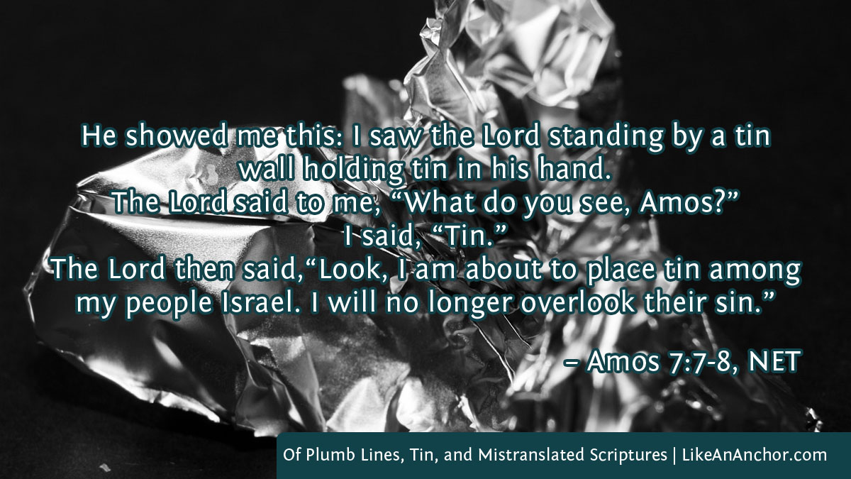 One of my go-to Hebrew dictionaries confirms that the “plumb line” translation is based on the assumption that anak means “plummet, plumb, lead-weight” (BDB; H594). It still seems like quite a leap to go from a word that you think means “lead” to translating it as “plumb line.” I guess translators didn’t think lead on its own made sense, so they tried to think of what lead might be used for in the context of a wall. Since lead weights could be used on plumb lines, and plumb lines would be used to make a wall vertical, we ended up with the plumb line translation in Amos 7. But then scholars did more work with the Akkadian language and learned the Hebrew anak most likely means “tin” instead of “lead.” Now we’re back to the problem of figuring out why God would give a prophet a vision of God holding a relatively soft type of metal while standing next to a wall made of the same metal, then say He’s going to put that metal in the midst of His people.