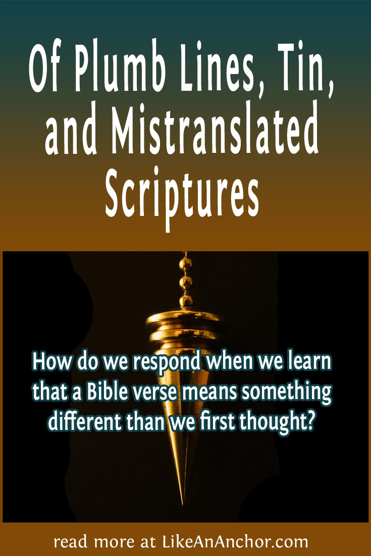 I recently came across another verse where something similar happened. In Amos 7, English translations typically talk about a “plumb line” that God placed in the midst of His people Israel. It’s an analogy that many like. A plumb line is “a line (as of cord) that has at one end a weight (such as a plumb bob) and is used especially to determine verticality” (Merriam-Webster). People have taken this analogy and run with it, and you can find dozens of articles and sermons talking about God’s plumb line and wondering if we measure up. But when I read this passage in the New English Translation, they used the word “tin” instead. It’s such a dramatically different translation that I dug into it more to see how that happened and to try and figure out what Amos 7 means.