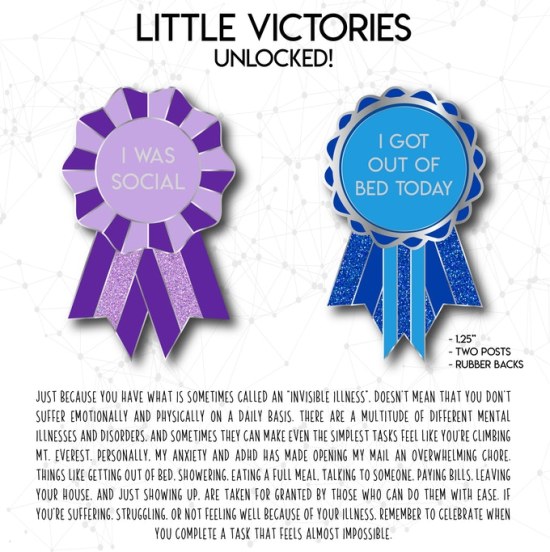 I backed a Kickstarter last week called “Own Your Stigma – A Pin Series.” The creator lives with anxiety, depression, and ADHD and wanted to make a series of enamel pins for other people with an invisible illness. The Kickstarter is closed now, but they’ll be opening up for other pre-orders within a few days if you’re interested. I’m not quite sure which ones I’m going to order yet, but I’m strongly leaning toward this one after the week I’ve had: