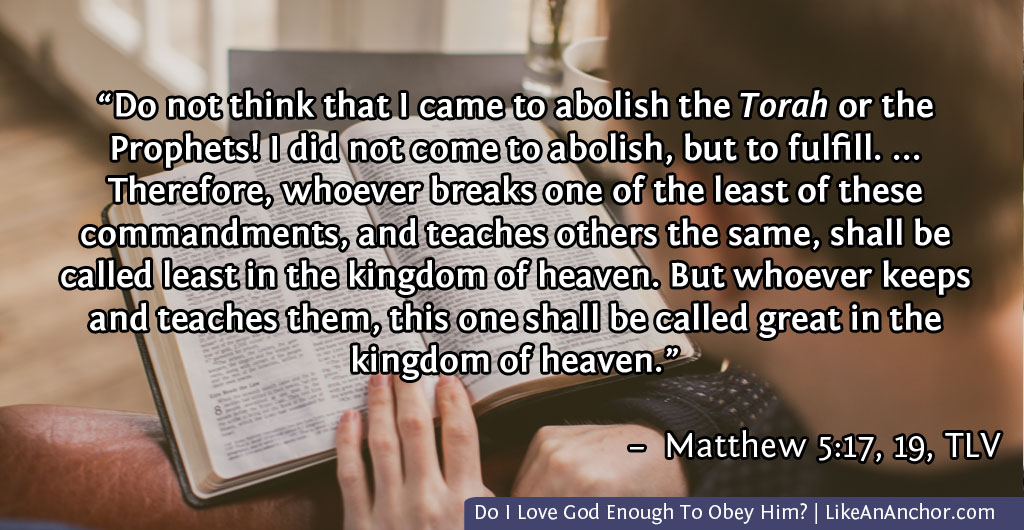 Psalm 119 speaks of God’s law as a source of delight, strength, liberty, hope, comfort, life, wisdom, righteousness, peace, and much more. How we keep God’s law is different now — elevated to a spiritual level in the New Covenant — but it still matters (this is largely what Romans is about). God cares about the relationship we have to His words and whether or not we love Him enough to do what He tells us to do. Which brings us to the question of today’s title, “Do I love God enough to obey Him?”