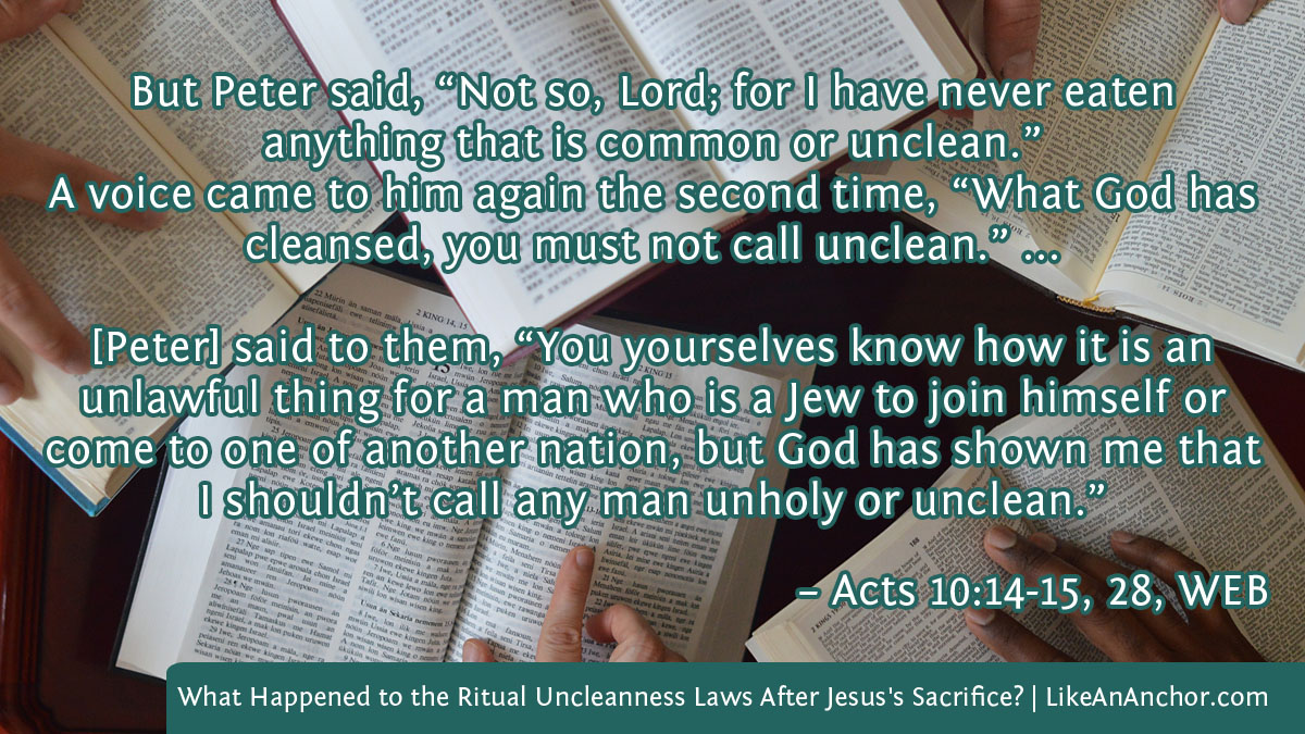 We’re not told exactly why touching certain animals, a woman being on her period, or a man having leprosy make someone “unclean” in the ceremonial sense. But we do know that up to the time of Jesus, these ritual cleanliness laws were enforced. In one case, “ten men who were lepers met” Jesus, but “stood at a distance” as they cried out, “Jesus, Master, have mercy on us!” (Luke 17:12, WEB). Jesus told them to go show themselves to the priest, as the Law instructed so they could be declared ceremonially clean after being cured of leprosy.