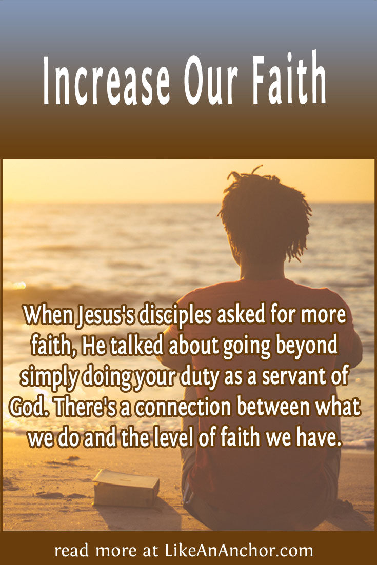 The disciples asked for more faith, and Jesus gave this enigmatic response. First, He told them what they could do if they had faith. Then, he told them this story about the slave and the master. Finally, He gave them an instruction: “So you too, when you have done everything you were commanded to do, should say, ‘We are slaves undeserving of special praise; we have only done what was our duty.’” It’s this story and concluding instruction that serve as the answer to the disciples’ plea, “Increase our faith!”
