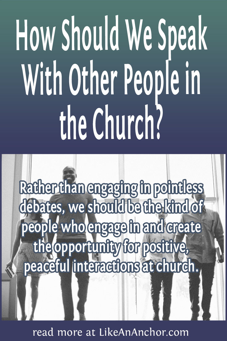 If I do have the opportunity to get into a debate, I often find myself eager to show-off my scripture knowledge or defend my beliefs, but based on Paul’s instructions to the Romans, Timothy, and Titus that’s the wrong response. The best thing to do is avoid such arguments. After one or two attempts to warn or correct a person who consistently starts this kind of contentious debates, we’re even instructed to avoid them (Rom. 16:17; 1 Tim. 6:3-5; 2 Tim. 2:23; 3:1-5; Tit. 3:9-11). Rather than engaging in pointless debates, we should take the higher ground and model a more excellent way. We should seek to be the kind of people who engage in, start, and create the opportunity for positive, peaceful interactions at church.