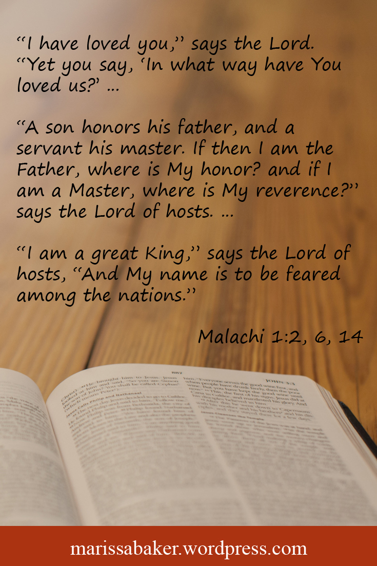 Malachi's Message | marissabaker.wordpress.comI think about this when I see a minister stand up in front of his congregation and say he just pulled an old message out of his files for today. A message about one of your old messages, which you freely admit you just cycle through every once in a while, just doesn’t seem like giving God your best. It’s something we all have to beware of — any time we set things we’re doing for God at a lower priority we’ve fallen into a dangerous attitude.