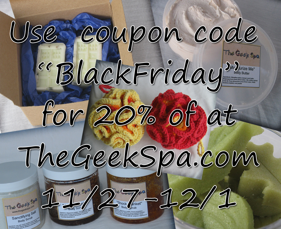 And lastly, a shameless plug for my Etsy shop. The Geek Spa is having a Black Friday sale. Use code “BlackFriday” for 20% off now through Monday.