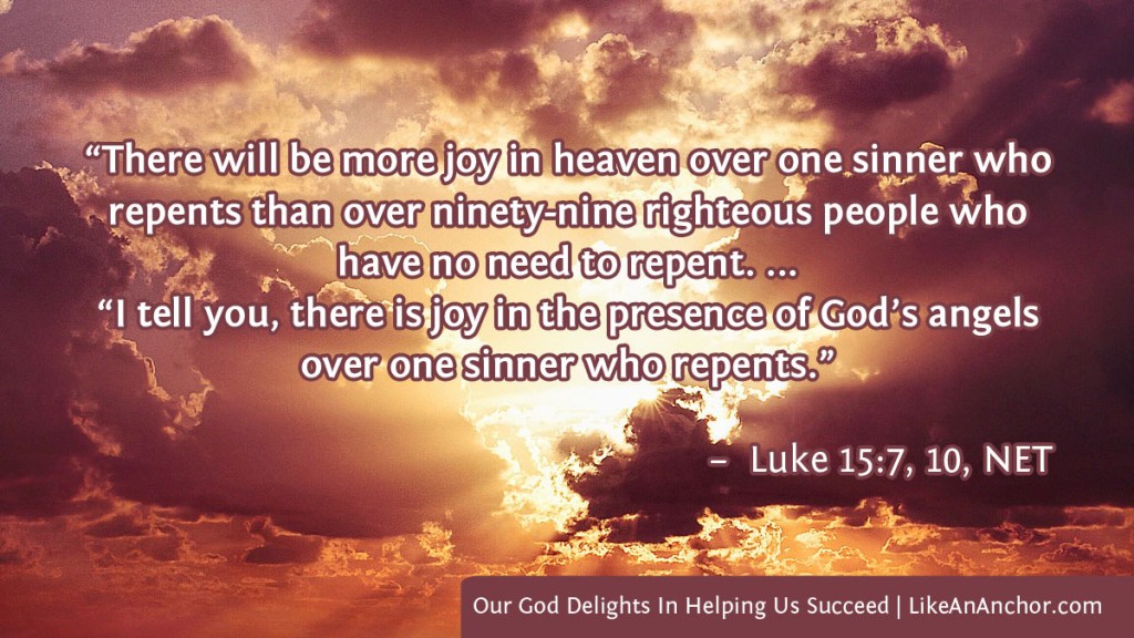 In Greek, one word translated “repent” is metanoeo (G3340). It includes the “regret or sorrow” aspect that is captured by the English word “repent,” but it also involves another step. The root words are meta (G3326: to be among or amidst, or to move toward that position) and noeo (G3539: “to exercise the mind, think, comprehend”) (Zodhiates entry G3340). Metanoeo is distinct from regret (metamelomai [G3338]) and includes “a true change of heart toward God” (Zodhiates). Thayer defines metanoeo as “to change one’s mind for better, heartily to amend with abhorrence of one’s past sins” (Thayer entry G3340). There’s a sense of turning around involved, as if when we sin we are walking away from God and when we repent we turn around and go toward Him again.