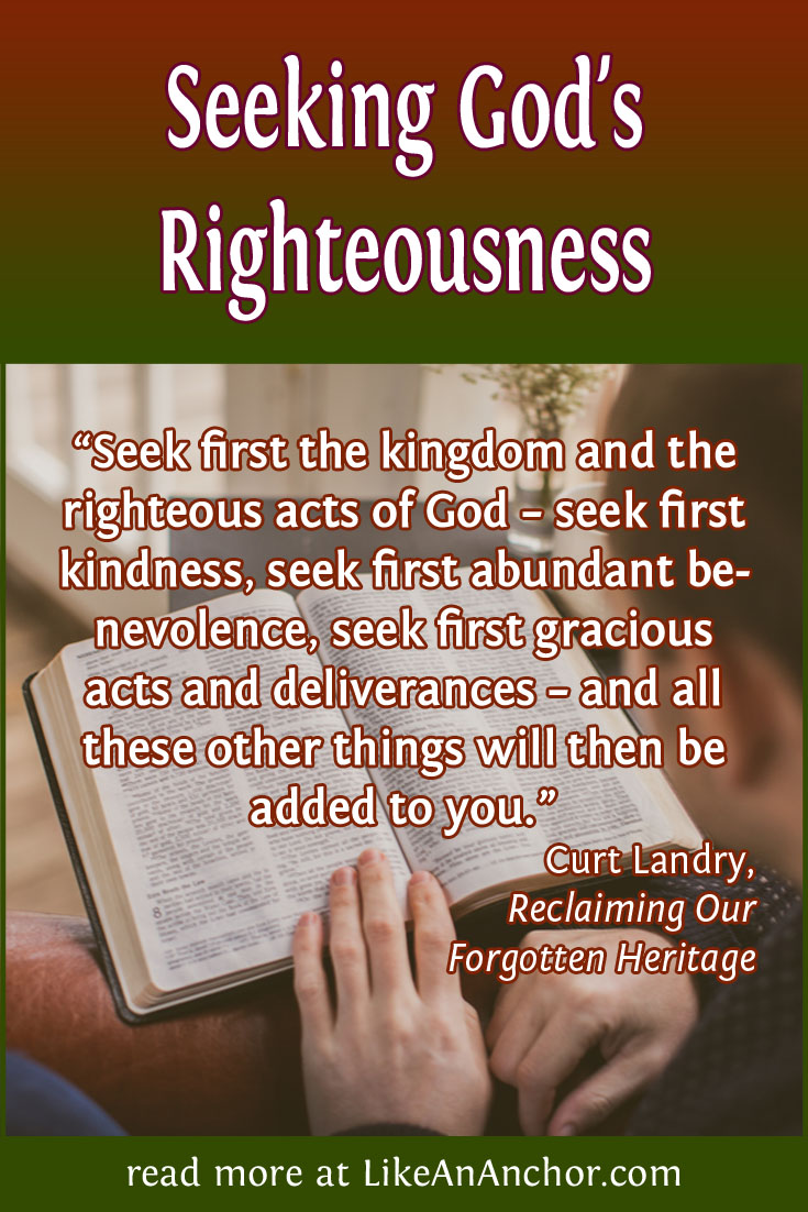 Through Christ, we have “become the righteousness of God” (2 Cor. 5:21). We’re to be “filled with the fruits of righteousness, which are through Jesus Christ, to the glory and praise of God” (Phil. 1:11). Righteousness isn’t just passively applied, though. We must “follow after righteousness” (1 Tim. 6:11; 2 Tim. 2:22) and seek God’s “instruction in righteousness” from scripture (2 Tim. 3:16; Heb. 5:13). To quote Curt Landry again, seeking first God’s kingdom and His righteousness “requires a daily walk of faith” that challenges each of us today.