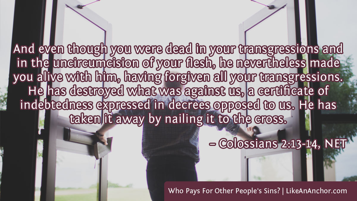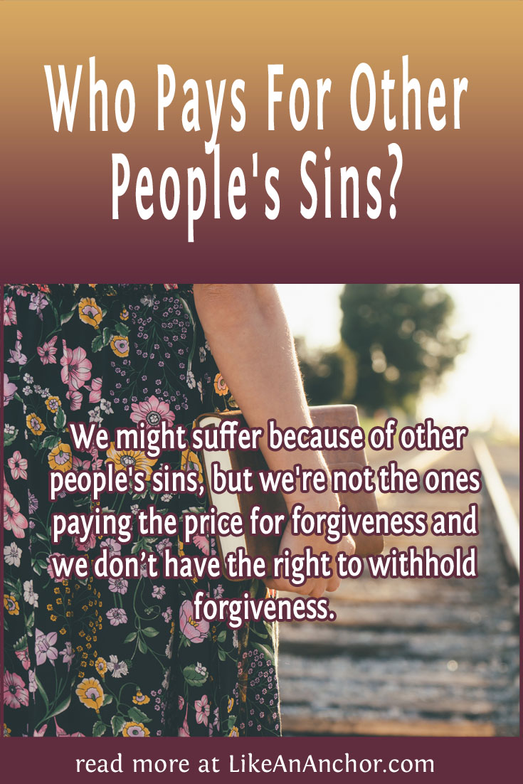 Now, at first, something in me grew hot and angry hearing this. I thought, “I’ve absolutely paid a price for other people’s sins when they’ve hurt me.” But then I realized that wasn’t the point of this statement. Yes, other people’s sins can affect us, sometimes very badly. However, the price of their sins that we’re talking about here refers to the price that God’s justice demands a sinner pay for violating His law. Ultimately, this price is death, or it would be without the sacrifice of Jesus (Rom. 6:23).