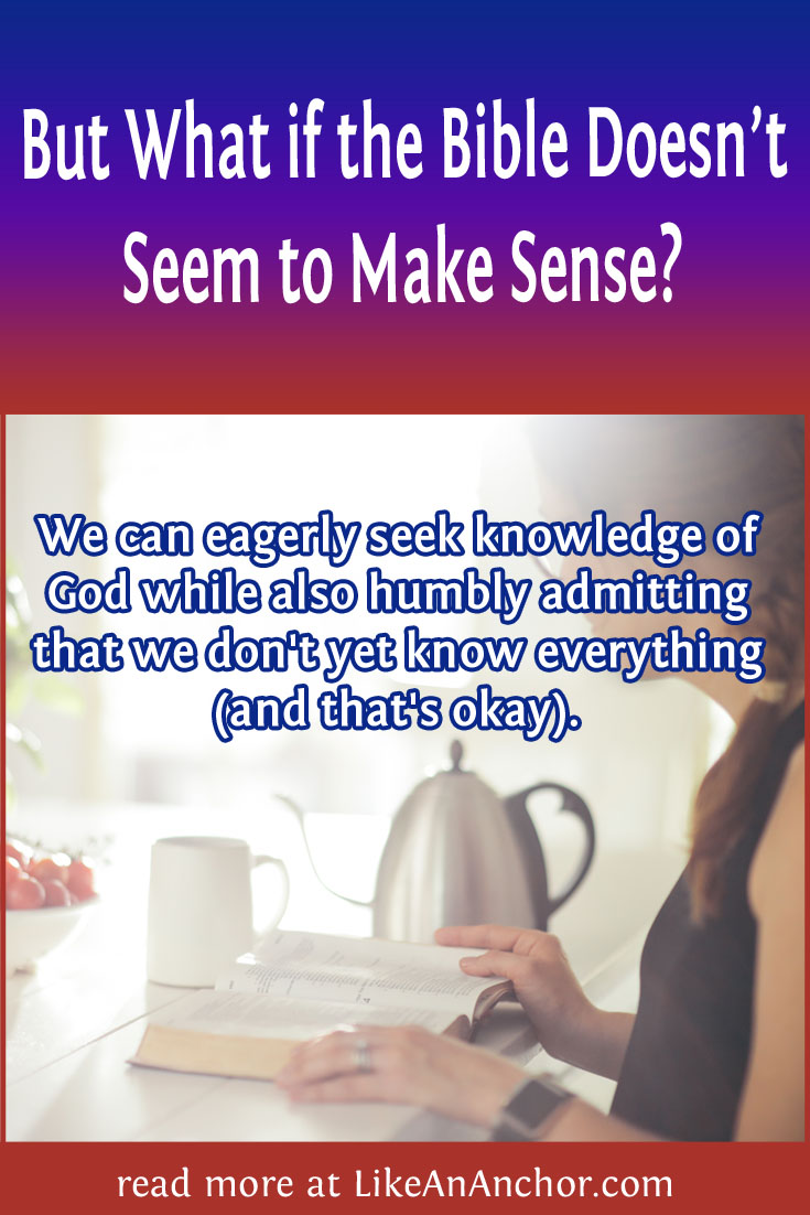 There are still parts of the Bible that don’t quite make sense to me. But I think now I’ve reached a point where I trust that God knows what He’s doing even if I don’t understand it. I can also trust that someday He’ll help me understand those things, even if that “someday” doesn’t happen in this physical life.